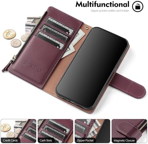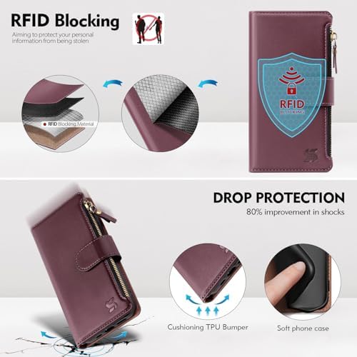 for Samsung Galaxy S24 FE 5G Wallet Case with Card Holder,Women Men RFID Blocking PU Leather Flip Cover Wrist Strap Zipper Credit Card Slots,Phone Case for Galaxy S24 FE 5G,Wine Red